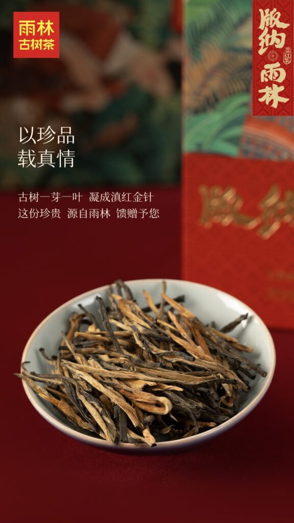 Yunnan Golden Needle is a premium black tea made from ancient-tree buds and one-leaf picks. The dry leaves are dark, glossy, and covered with fine golden tips, showing exceptional craftsmanship and quality.